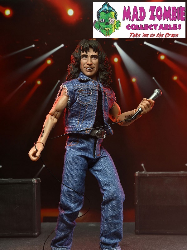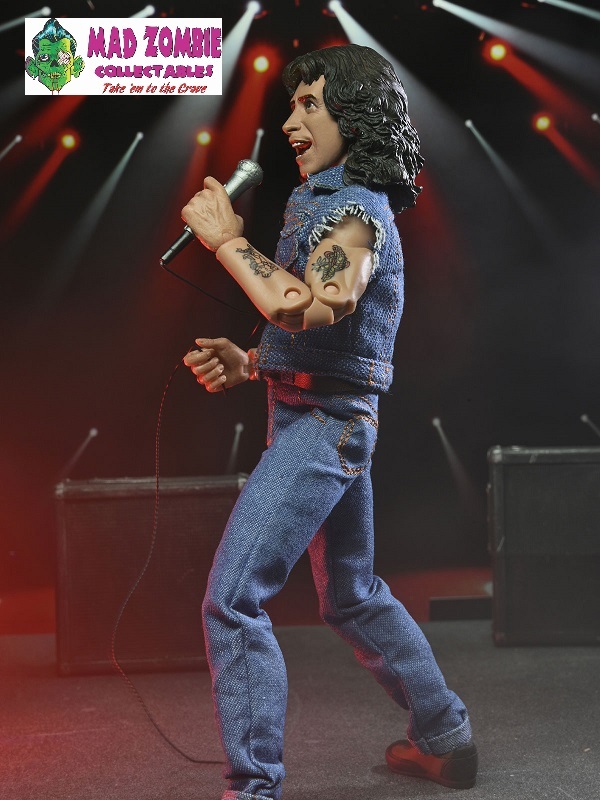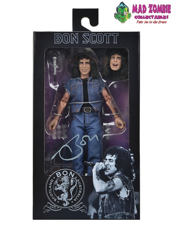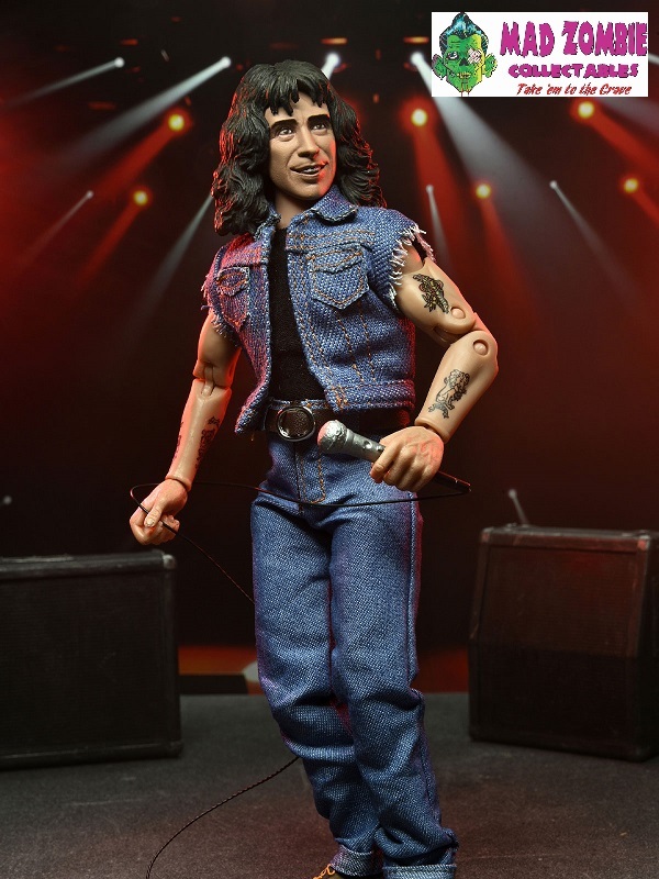 If rock singers were judged on a scale of 1 to 10, Bon Scott turns the dial to 11. One of the most influential front men of all time, Bon Scott's high-voltage vocals and rock 'n roll lifestyle set the bar for a generation of aspiring musicians. This fully articulated and extremely tattooed action figure is based on Bon Scotts appearance in AC/DCs "Highway to Hell" music video and stands 8 inches tall.