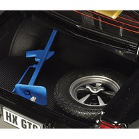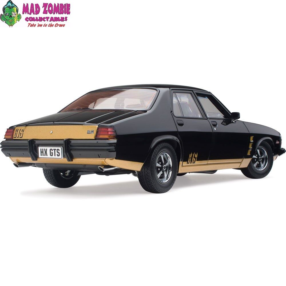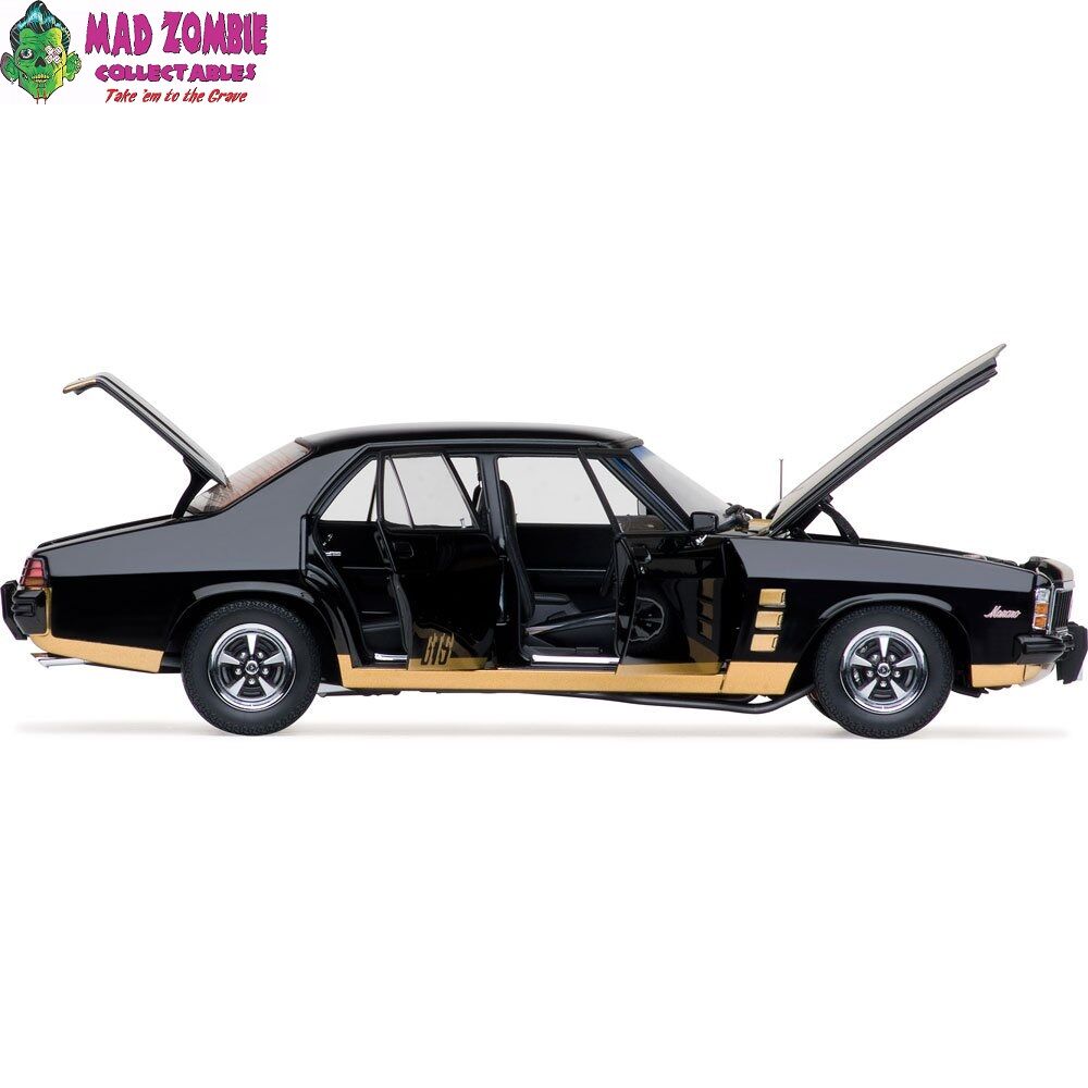 This 1/18 scale replica model is represented in the Tuxedo Black colour scheme. This sleek, deep black finish contributed to the vehicle's distinctive and bold appearance, enhancing its muscular design and complementing features like the refined grille and prominent GTS decals, including special "Gold-outs" instead of the standard "Black-outs" exclusive to the Tuxedo Black models. The HX series offered a range of vibrant colours, with Tuxedo Black standing out as a classic choice among enthusiasts