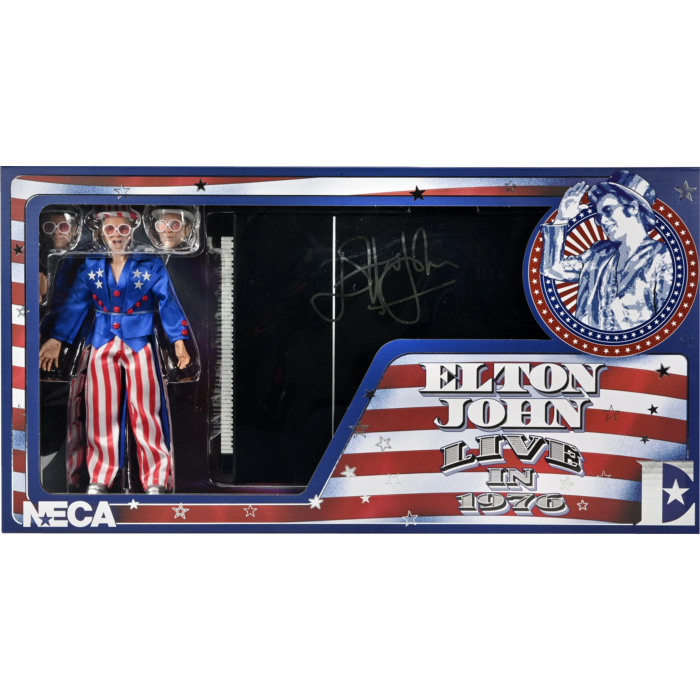 In StockFans of Elton John will be able to reminisce on his live 1976 performance with this 8” articulated Action Figure! Standing approximately 20cm tall, Elton wears his patriotic best; sporting a shimmering coat-tail tuxedo in red, white, and blue. This figure is made of plastic and fabric and comes with a piano that measures 12”, approximately 30cm. Based on Elton’s Louder Than Concorde, display him with his iconic piano as the perfect addition to your shelf!