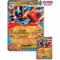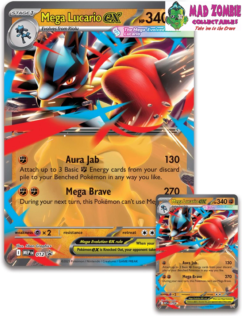 Showing no mercy, Mega Lucario ex pummels opponents while sharing discarded Energy with your Benched Pokémon! Bring this massive power to your own collection as a playable foil promo card paired with an oversize promo card and a detailed figure showing off Mega Lucario in action.