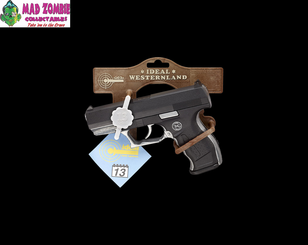 13-shot black detective pistol with movable slide, 16.5 cm made of diecast metal and plastic