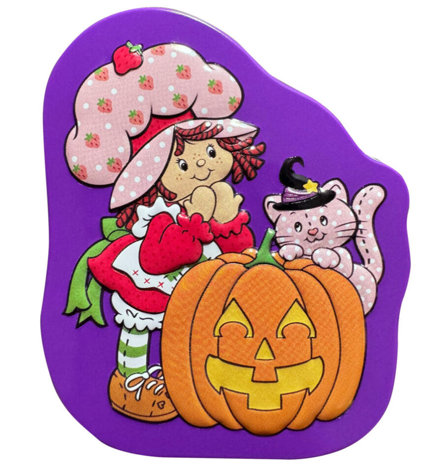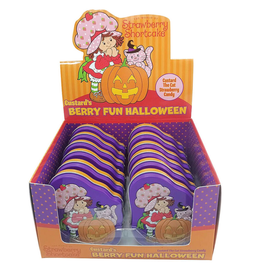 In StockCelebrated a berry fun Halloween with Strawberry Shortcake and her cat, Custard. The tin is filled with 1.2 ounces of strawberry flavored Custard the cat candy.