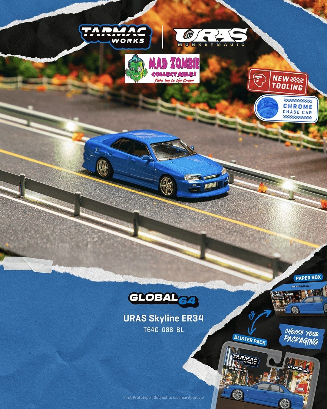 Tarmac Works Global 64 - URAS Skyline ER34 Blue (Possible Chase Supplied) - (PRE-ORDER)