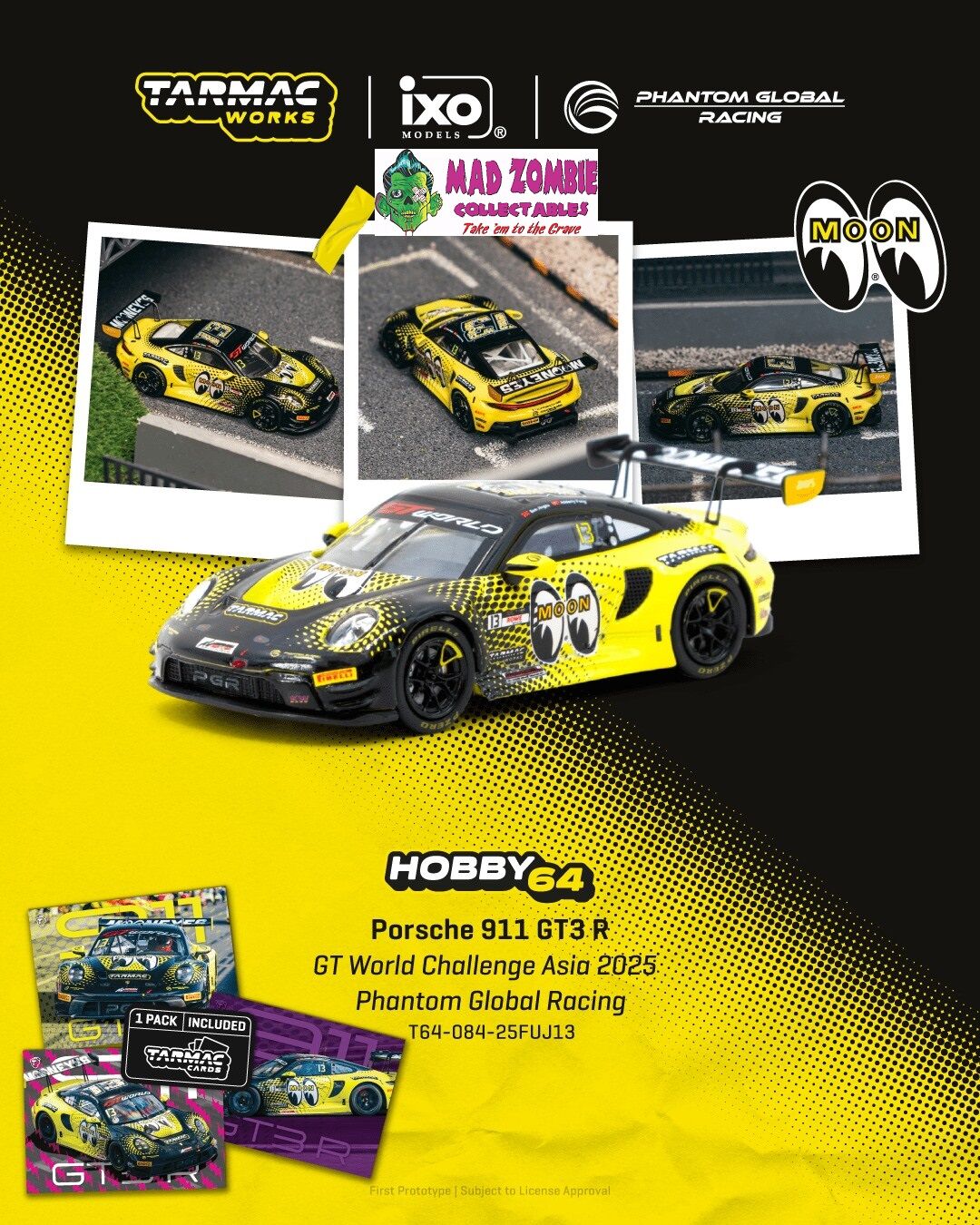 Tarmac Works Hobby 64 - Porsche 911 GT3 R GT World Challenge Asia 2025 Phantom Global Racing Sun Jingzu / Adderly Fong Model Car + Trading Cards Combo
