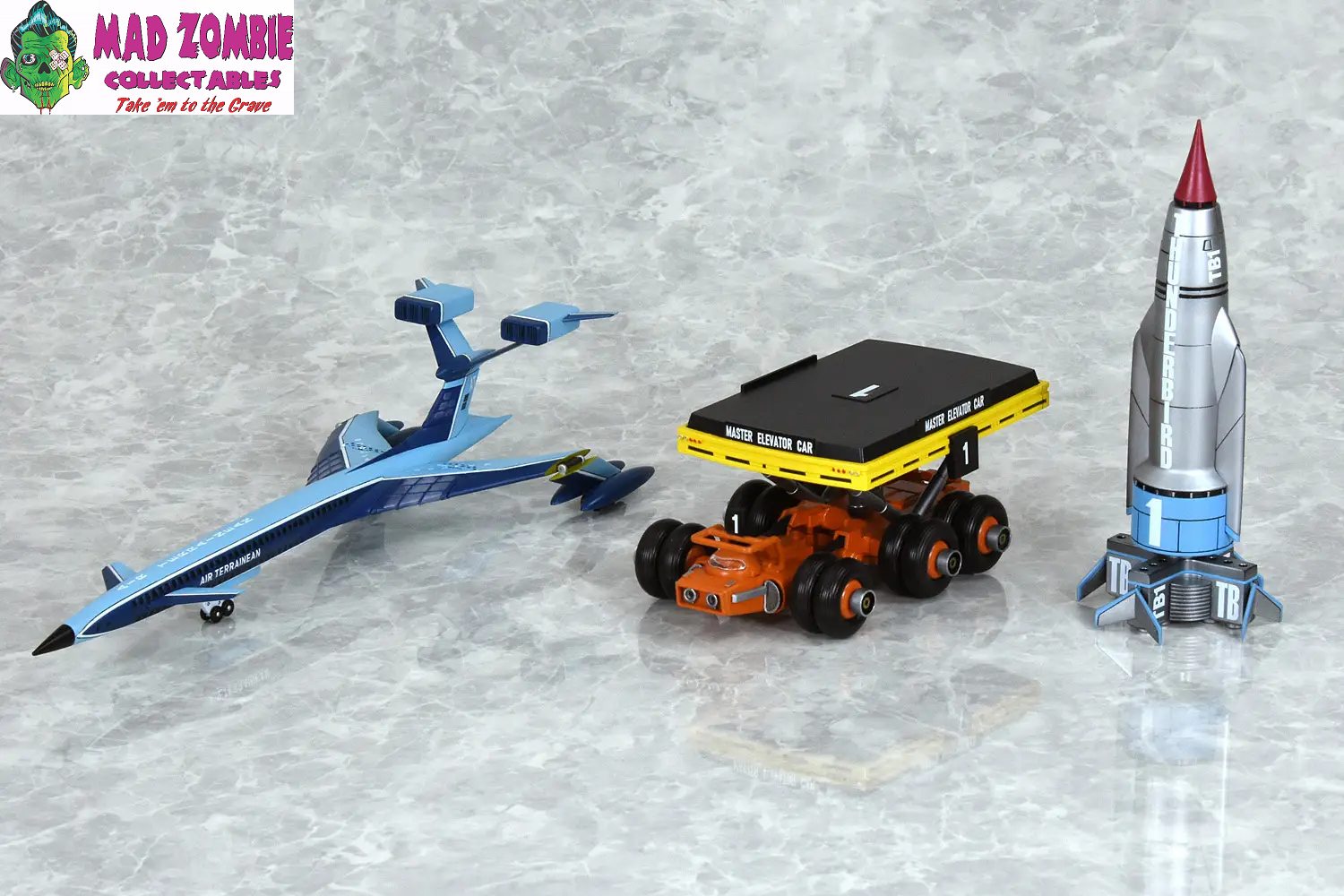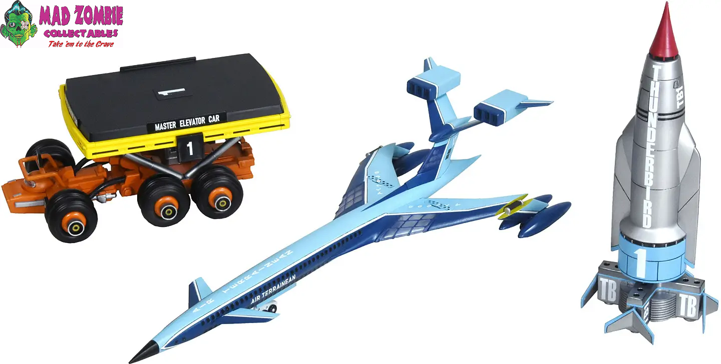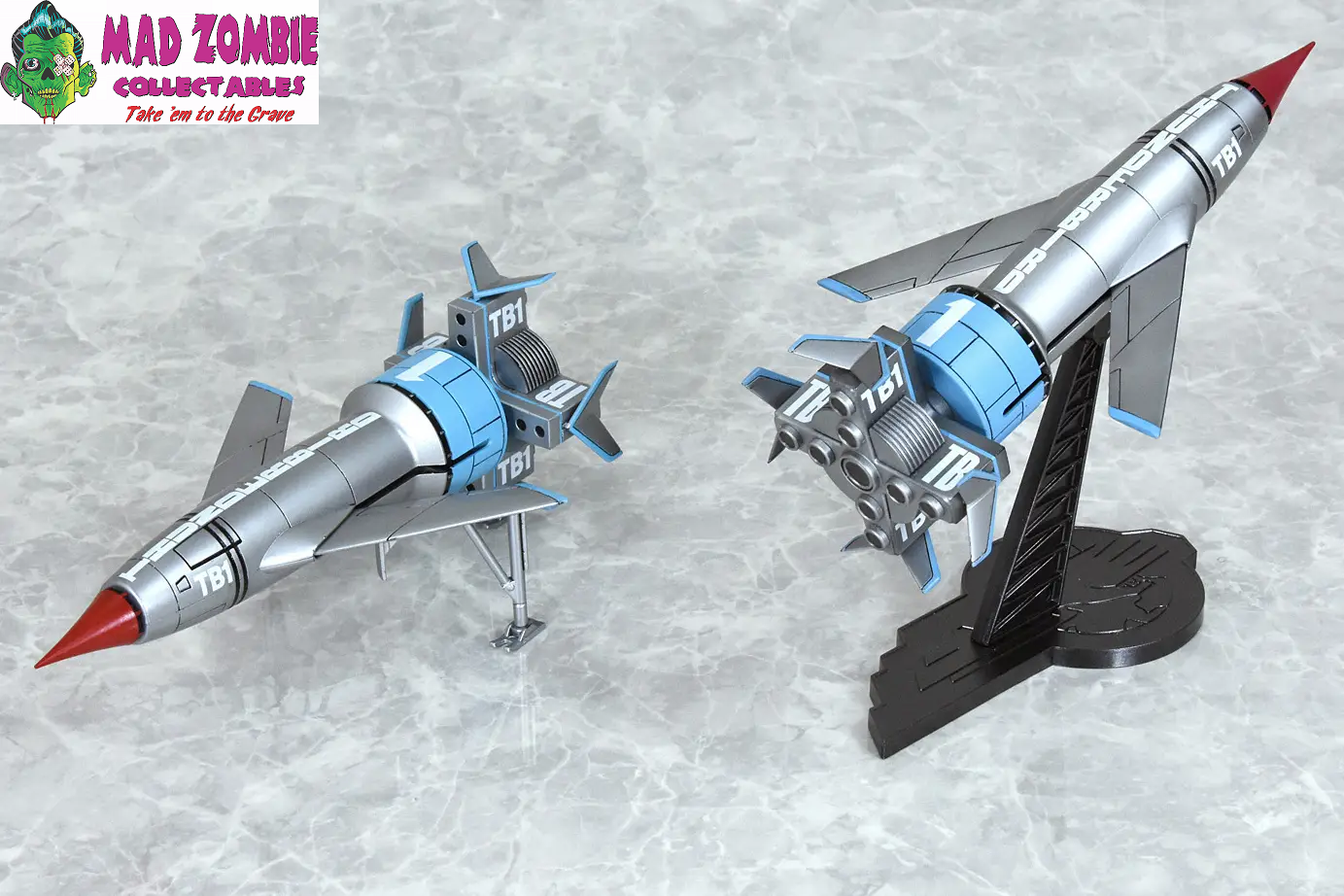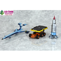 - Thunderbird No. 1 -- 1/250 scale, total length approximately 14cm when completed; can be recreated in both flight and landed forms, display stand included.